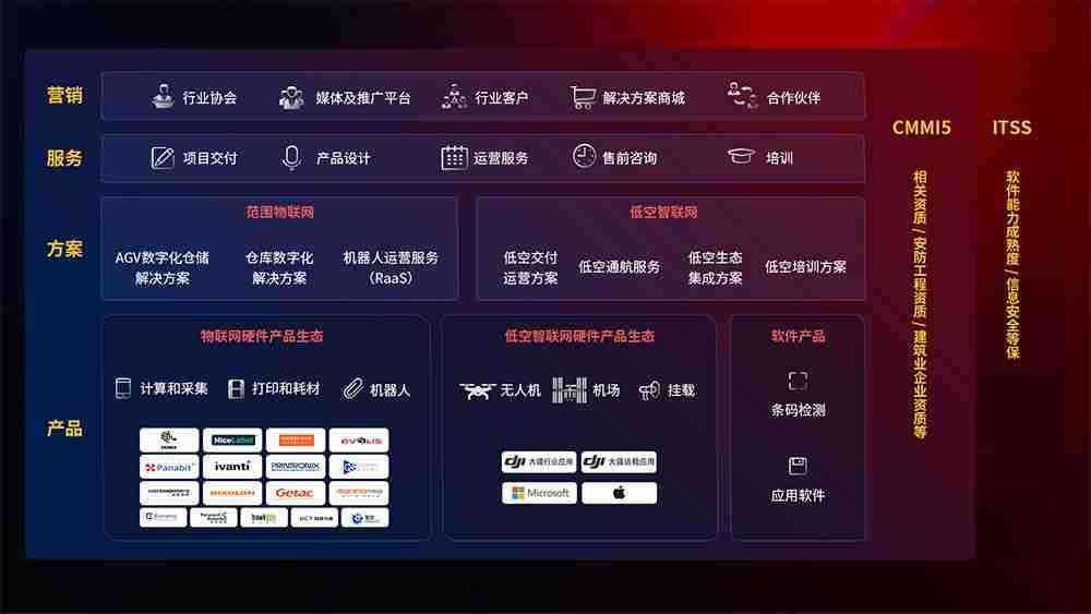 聚合国内外先进的物联网硬件产品品牌,,,聚焦数字化仓储、、、、机器人运营、、低空智联网等领域,,,共同打造适合客户业务场景的解决方案并提供交付服务
